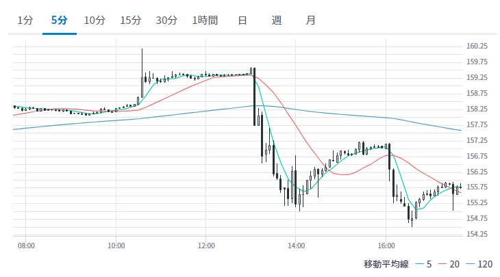 今日も円安進行で13時までは159円台を推移していたが、13時00分からの下落で13時05分には一気に157円台へ。
